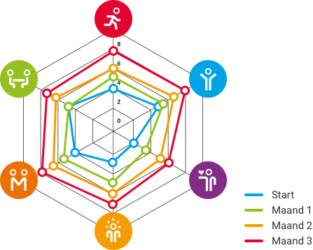 Hieronder ziet u een voorbeeld van een spinnenweb van positieve gezondheid. Onder het spinnenweb kunt u naar Mijn Positieve Gezondheid gaan.